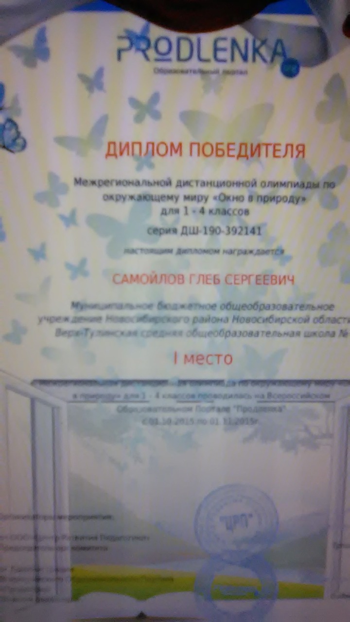 Самойлов Глеб 1 место "Межрегиональная дистанционная олимпиада по окружающему миру "Окно в природу"".