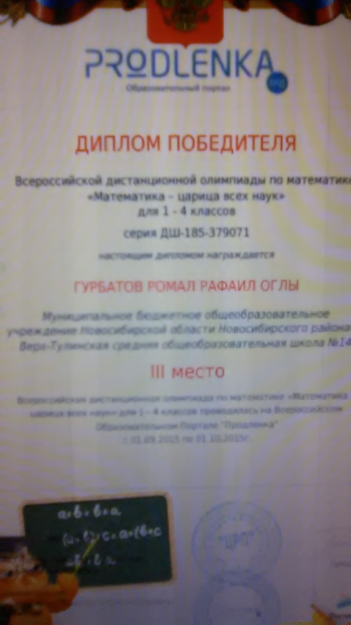 Гурбатов Ромал 3 место во "Всероссийской дистанционной олимпиаде по мптематике "Математика - царица всех наук"".