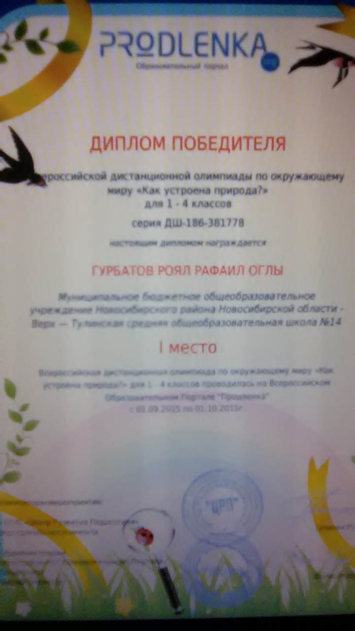 Гурбатов Роял 1 место во "Всероссийской дистанционной олимпиаде по коружающему миру "Как устроена природа"".